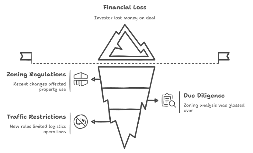 Six months after closing, when the investor tried to lease the space to a logistics company, the city informed them that the proposed use violated the new traffic restrictions. The cost to modify the building and loading areas to comply would exceed $800,000. Worse, the modifications would reduce the usable space so significantly that the economics no longer worked for most potential tenants.